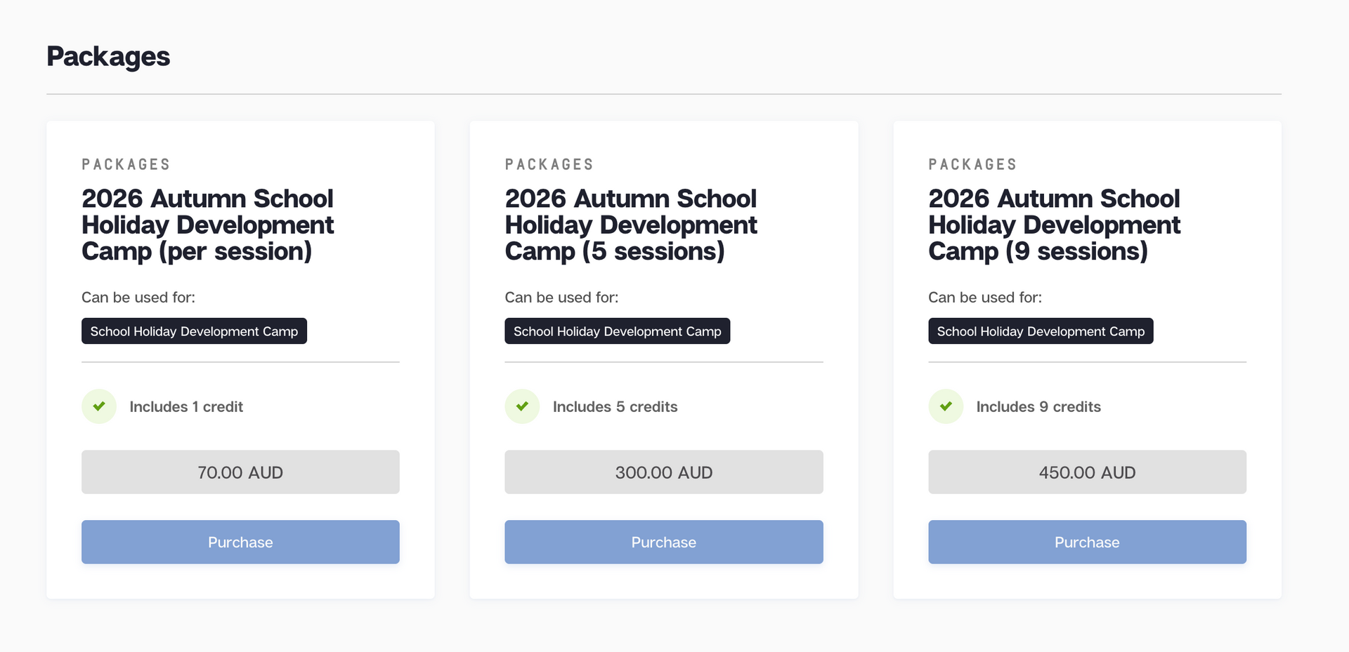 2. Locate the "Autumn School Holiday Development Camp" Packages: